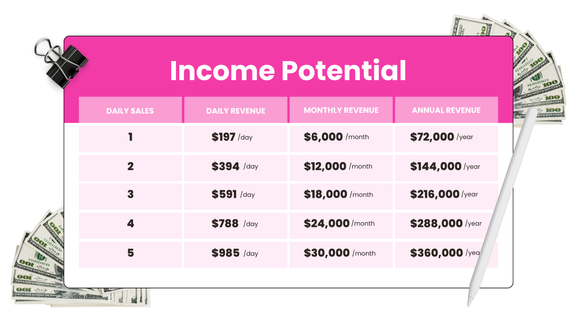 The chart below is designed to spark your inner flame. It's an example of what is possible is you sold a digital product, online course, or coaching program for $197. The price can, of course. vary depending on your niche and industry. This is purely to show you the potential.