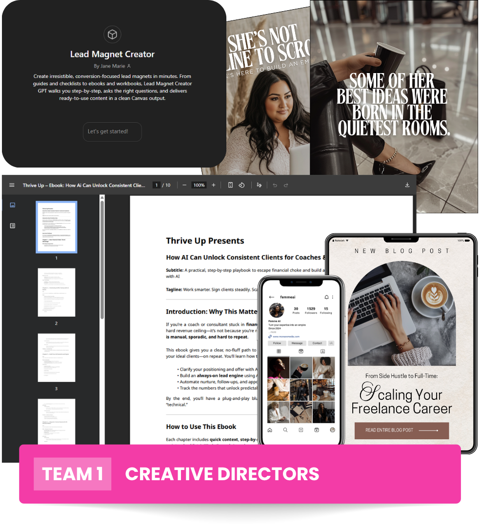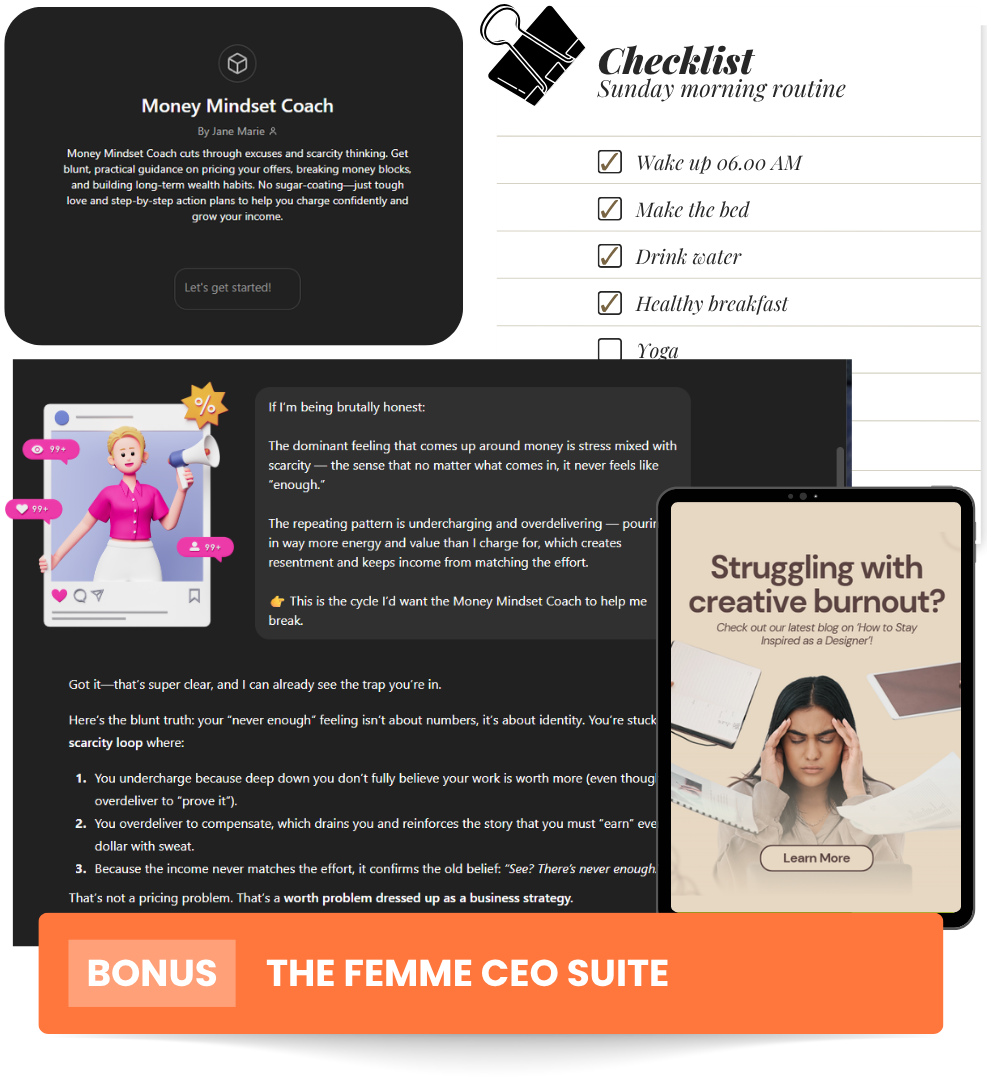At FemmeAI, we believe more money belongs in the hands of visionary women like you. You’re not just a coach, a creator, or a service provider… you’re a CEO. And with the right tools, scaling to $5K, $10K, or even $100K months isn’t just a dream… it’s a download away.
